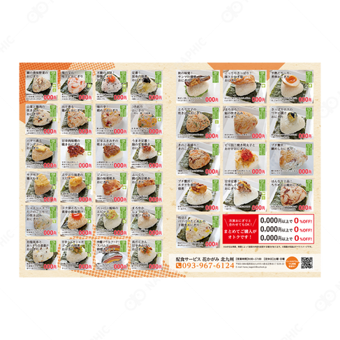 配食サービスの冷凍弁当と冷凍おにぎりのパンフレットです。