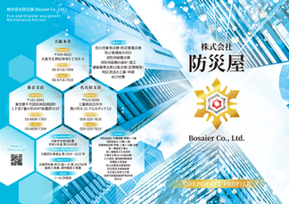 防災業者の会社案内パンフレットです。 株式会社防災屋は「予防時代をリードする」ことを理念に掲げ、人命を守る防災の最前線を支える企業です。